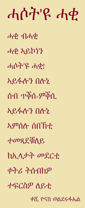 ግጥምታት ቀሺ ዮናስ፡ ብሓፈሻ ደስ እዮም ዝብሉኒ። ብዘይካ እዝን ኣብ ላዕሊ ዘለዋ 2ግጥምታት፡ ካብኡ ናብኡ ካልኦት ኣዝየ ዝምሰጠለን ፦ (ምዕሻው’ዩ ከቢድ ፥ ሽግር ከመዓልካ ፥ ኣደይ ሚዛን ፥ ሓጓሚ ፥ ርስሓት እዝኒ) ጠቒሰ፡ በዛ ብዙሕ ብግጥማዊ ጽባቐኣ ተስክረኒ ግጥሚ ክድምድም፦