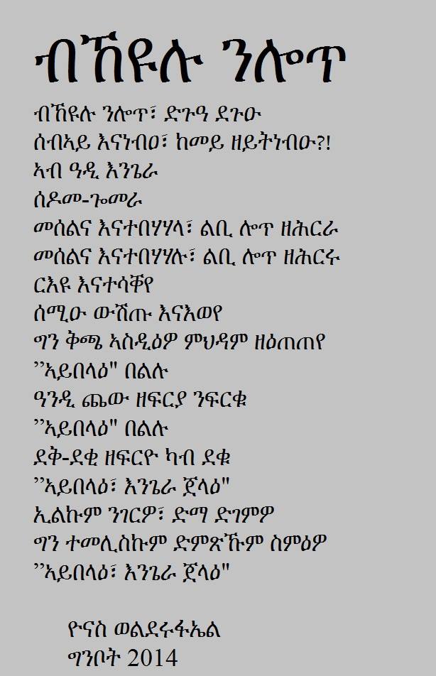 ኣብዛ ግጥሚ ዘሎ ጽባቐ! ንብብ ውዒልካያ ንብብ ሓዲርካያ ’ውን መመሊሳ እያ ትፍተወካ ። ነቲ ”ስነ ጥበብ፡ መስትያት ዘይኮነ ፥ መዶሻ ሕብረተሰብ’ዩ” ዝብል ፍልስፍና ይመስል እምነቱ ክብሎ ዝተደረኽኩ፣ ብምሉእ ትብዓት’ያ ተንጸባርቖ።